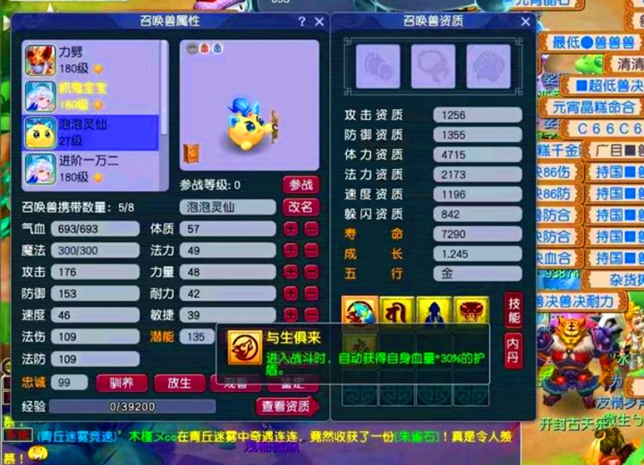 上面的这只泡泡灵仙现在拥有着净台妙谛和欣欣向荣,而且本身的特殊技能是与生俱来,在进入战斗的时候能够获得自身血量30%的护盾,欣欣向荣和净台妙谛的叠加刚好就能够让上面的这只召唤兽的血量特别雄厚,也就是上面的这只召唤兽进入战斗以后将会有更强的生存能力。这只召唤兽打造成品后在pk中甚至都是不死的。