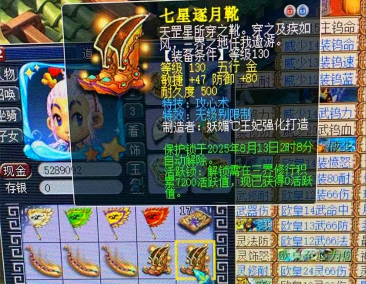 看到上面的这双鞋子了吗?这是一双130级的鞋子,上面的这双130级的鞋子拥有着两个蓝字效果,这两个蓝字效果分别是无级别限制和攻心术。攻心术是4月份门派调整的时候新上线的一个特技,攻心术的特技可以说是法系必备的,所以上面的这双鞋子的价值就比较高了,上面的这双鞋子的价值应该能够达到几百个W,这应该是现在梦幻西游中所上线的第1双拥有新特技的130级以上的双蓝字无级别的装备。